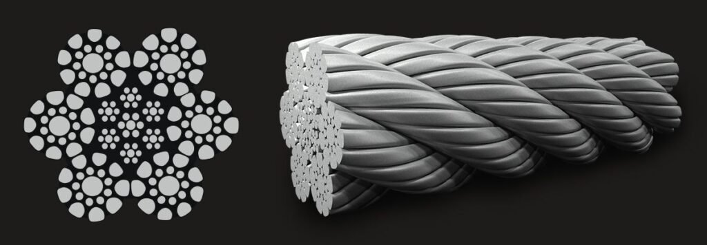 6×19 Seale Compacted construction is a wire rope construction with superb breaking load characteristics and is used in a wide range of applications, available with both FC (fibre core) and IWRC (independent wire rope core). The construction has proved particularly popular for applications where the additional resistance to wear and abrasion provided by the larger outer wires is superior to the other 6×19 constructions.