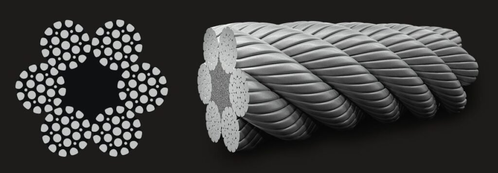 6×19 filler (often referred to as 6×25) is available with both FC (fibre core) and IWRC (independent wire rope core). With a fibre core, and due to the smaller wires used within the construction, 6×19 filler will generally achieve a superior fatigue life to the other 6×19 constructions. 6×19 filler wire rope has been a very popular construction for producing wire rope slings from 1 tonne safe working load up to 5 tonnes. One very good example is the high volume use of this construction in the North Sea Oil industry where it is used for the production of pipeslings.