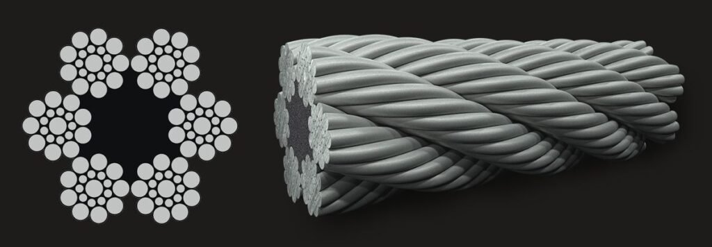 6×19 Seale construction is a wire rope construction with superb breaking load characteristics and is used in a wide range of applications, available with both FC (fibre core) and IWRC (independent wire rope core). The construction has proved particularly popular for applications where the additional resistance to wear and abrasion provided by the larger outer wires is superior to the other 6×19 constructions.