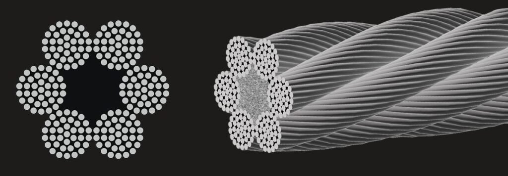 6×37 is a cross laid construction used for general engineering applications. 6×37 is also available with IWRC (independent wire rope core). In the UK 6×36 is a far more popular construction, whilst on the European mainland, vast quantities of 6×37 are used for a variety of applications.