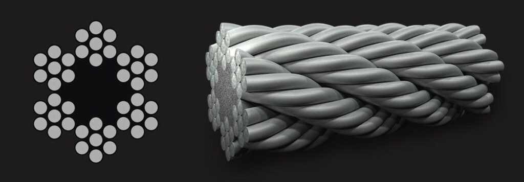 6×7 construction general purpose wire rope is available with either FC (fibre core) or WSC (wire strand core). When supplied with a WSC the rope is more commonly referred to as 7×7. The rope is very popular in smaller diameters from 0.5mm to 2mm where the cable remains very flexible. 6×7 ropes become quite rigid in the larger diameters and are often considered stiff in diameters 6mm and above. In these diameters, they tend to be used for applications where the rope is omitted/not working. A typical example is a mast stay. 7×7 construction is readily available in both galvanised and marine-grade stainless steel.